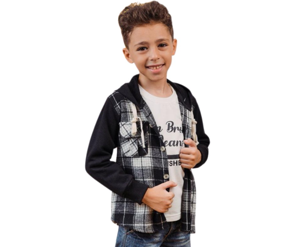 black checked shirt over a white T-shirt with printedÂ